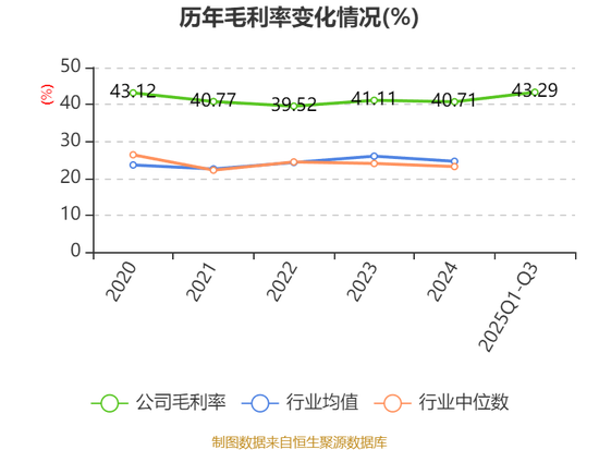 财报显示,2025年前三季度,华帝股份营业收入达41.58亿元,归母净利润达3.56亿元。其中,最值得关注的是,根据恒生聚源数据库,华帝股份的毛利率在行业中处于较高水平。前三季度整体毛利率同比上升2.79个百分点,达到43.29%。