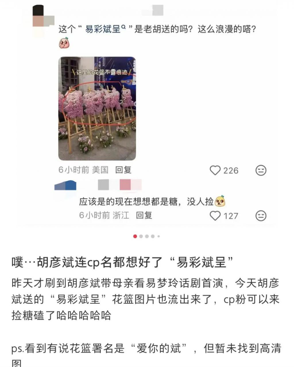 确实,今年 11 月,有路人拍到胡彦斌易梦玲在马尔代夫劲爆热吻照。早在 8 月底,就有网友撞见胡彦斌给在郝蕾训练营上课的易梦玲送咖啡;今年的乌镇戏剧节,胡彦斌带母亲去看易梦玲参演的话剧,后台花篮呈现出“易彩斌呈”的字样,网友调侃“胡彦斌把 cp 名都想好了”。