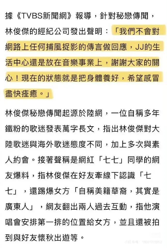 早在今年 2 月,就有传言称林俊杰正在和这个网红热恋。后来,林俊杰经纪公司对此表示: “我们不会对网络上任何捕风捉影的传言做回应,JJ 的生活中心还是放在音乐事业上,谢谢大家的关心!” ,既没承认也没否定。
