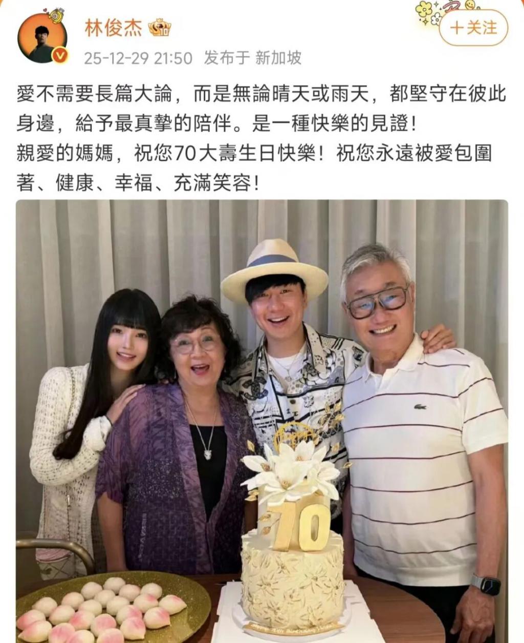 12 月 29 日晚,林俊杰在社交平台发布一张全家福为妈妈庆生,并配文:“爱不需要长篇大论,而是无论晴天或雨天,都坚守在彼此身边,给予最真挚的陪伴。是一种快乐的见证!亲爱的妈妈,祝您 70 大寿生日快乐!”。