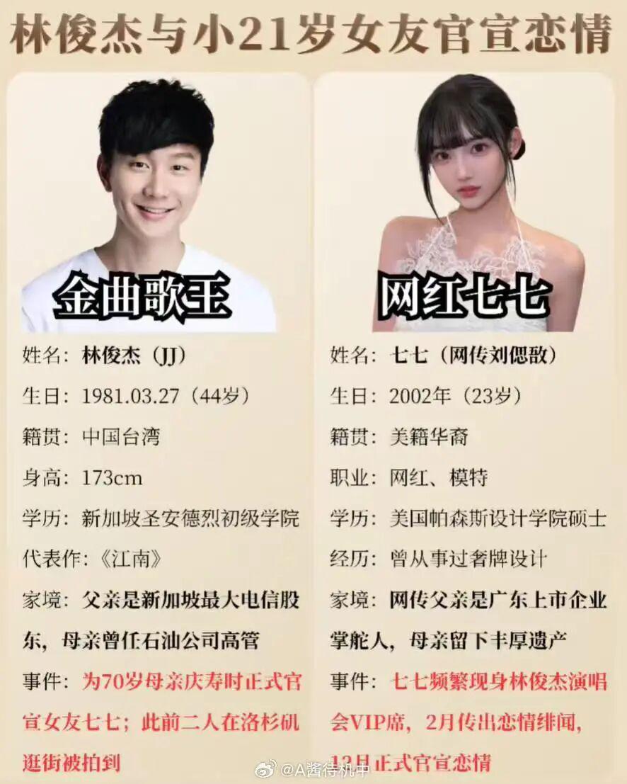 消息一出无疑引发全网的激烈讨论。很快,女生被曝是 24 岁的美籍华裔网红“七七”,和林俊杰相差 21 岁。
