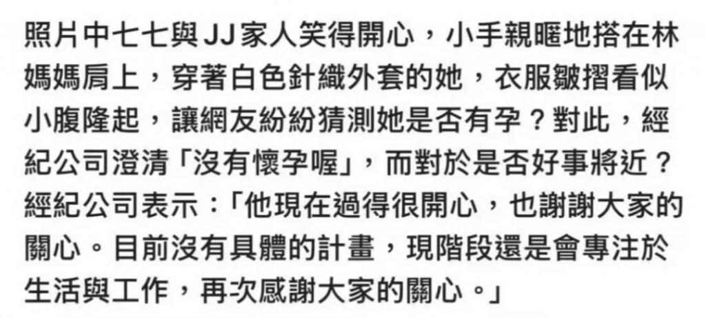还有人说从照片看,七七有轻微浮肿,疑似怀孕。不过后来林俊杰方辟谣了。