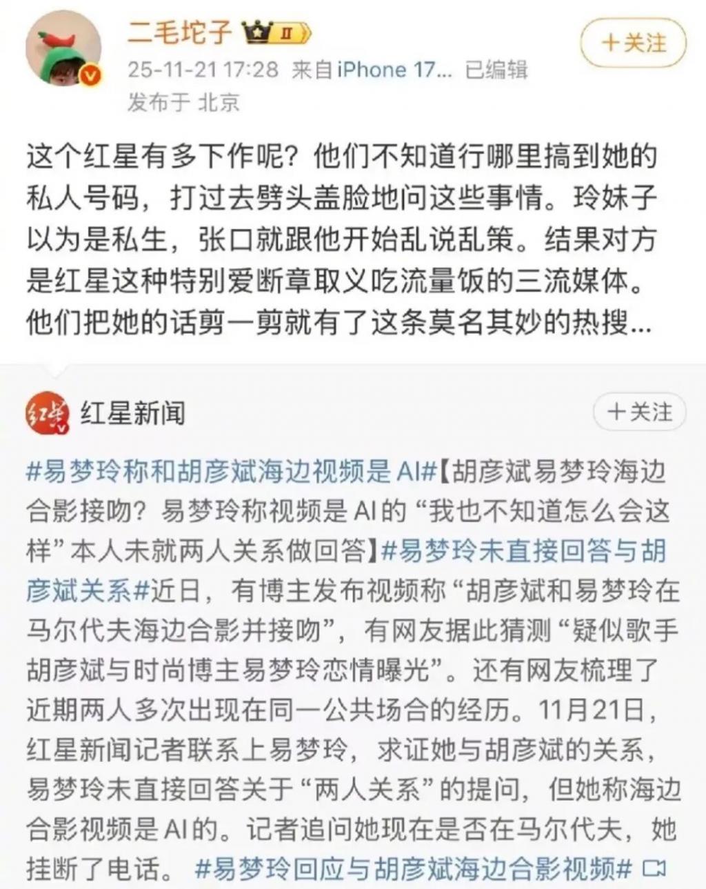 尽管易梦玲好友后来解释称当时误以为是私生饭才说 AI,但完整通话录音曝光后,显示她当时明确知道对方是媒体,这番辩解瞬间站不住脚。而胡彦斌后续疑似在朋友圈回应称“也没有义务向全世界汇报”。